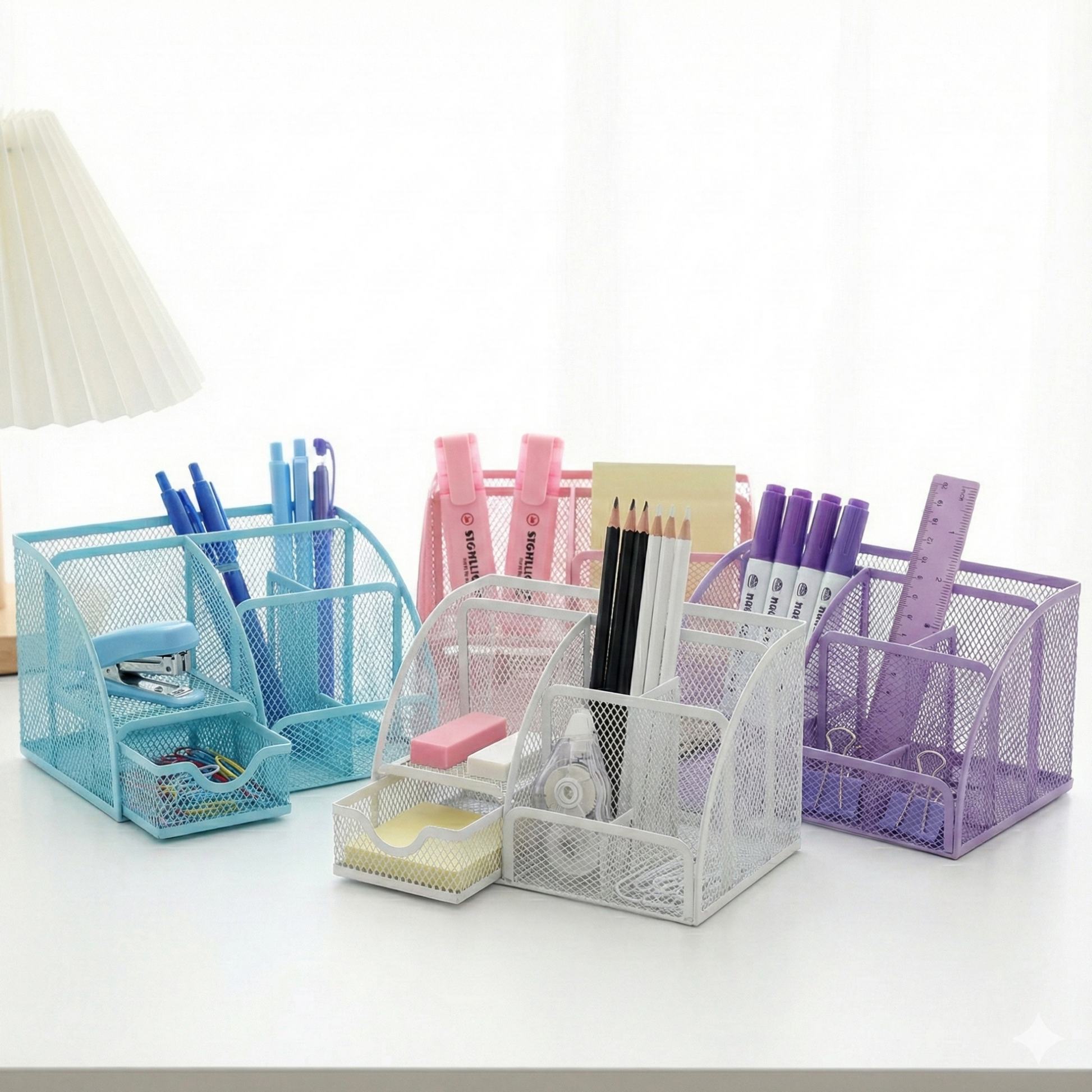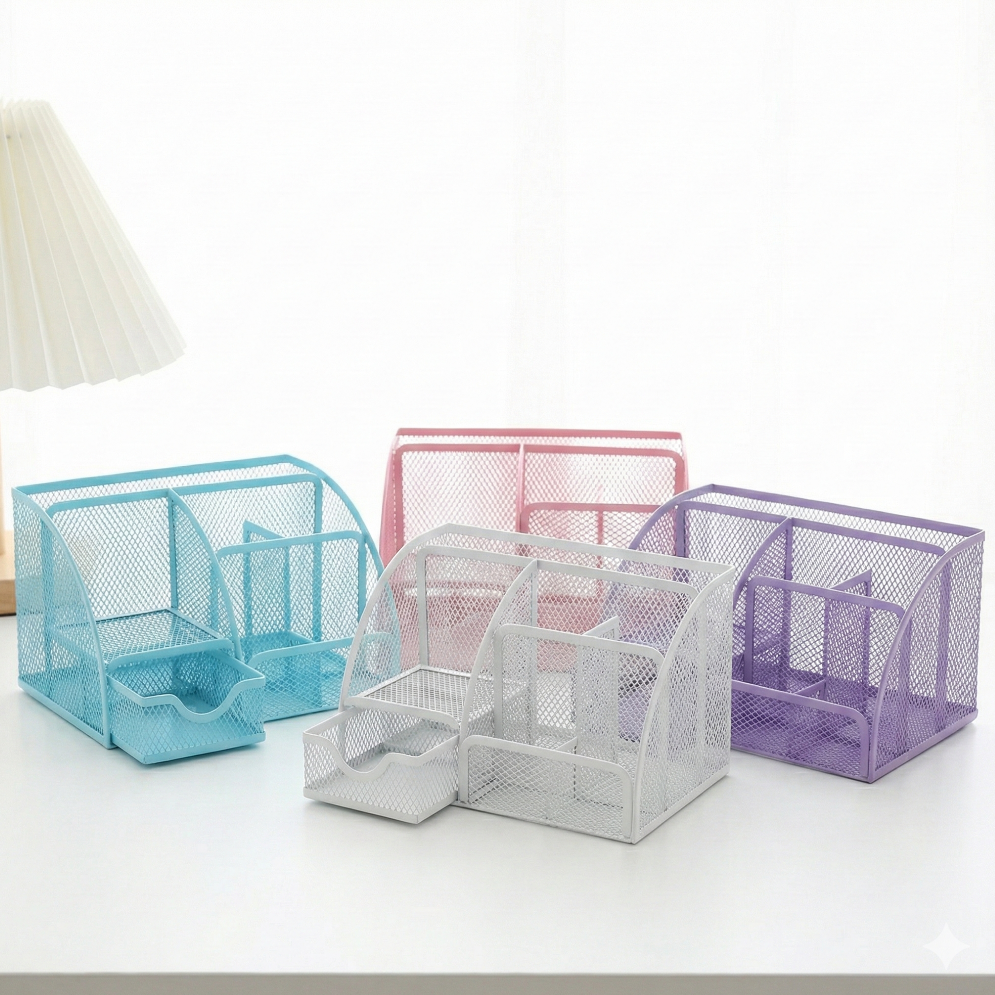 Upgrade your workspace with the ultimate organization solution—the "Super 7" Mesh Desk Organizer! Built from sturdy, high-quality metal mesh, this durable station features seven distinct zones to keep your desk clutter-free. With a sleek finish available in vibrant pastel colors, it combines functionality with modern aesthetics, making it the perfect home for your pens, notebooks, sticky notes, and paper clips.