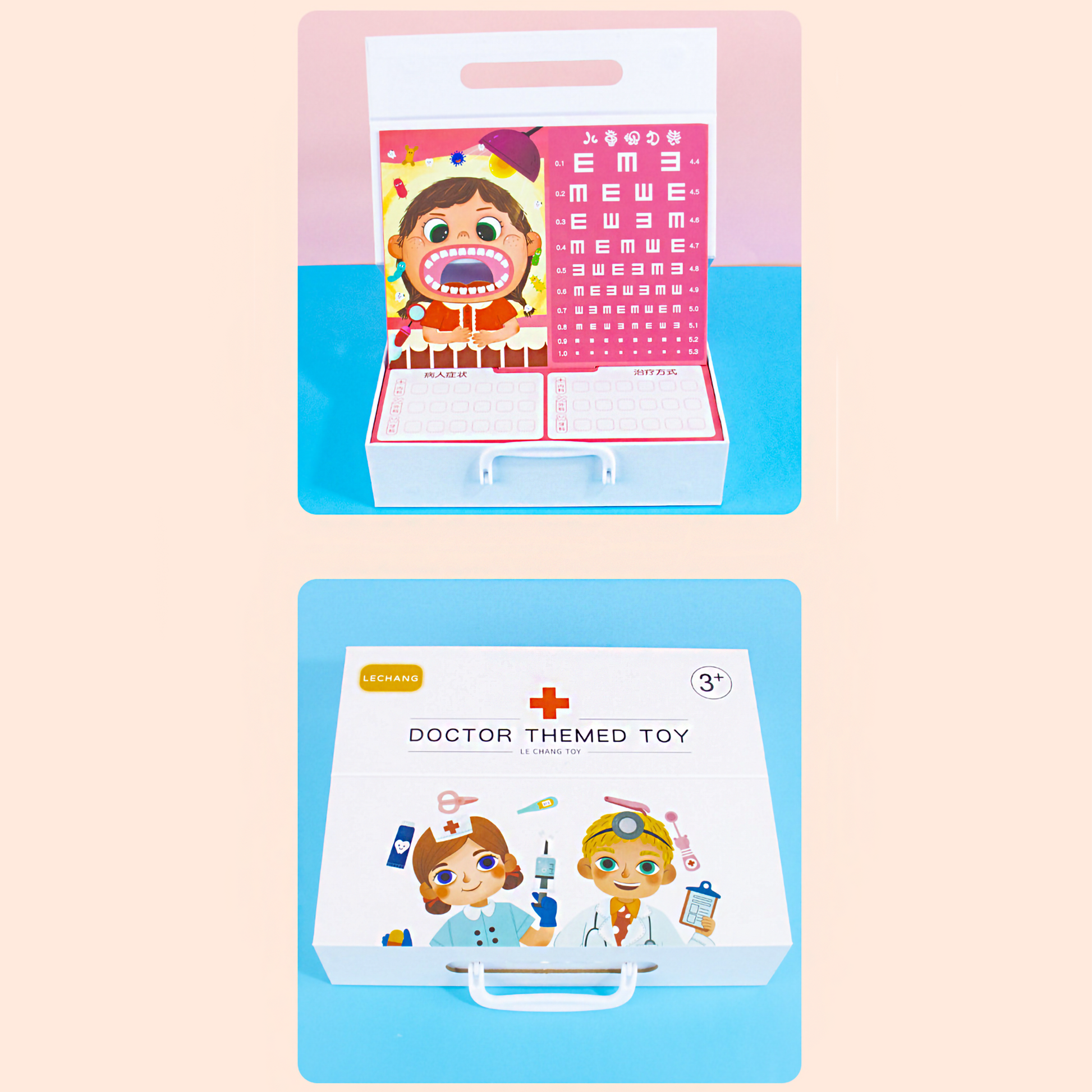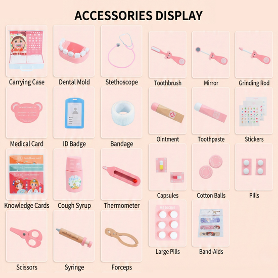 Package Contents: Stethoscope, Teeth Model, Syringe, Thermometer, Dental Tools, Wooden Pills/Capsules, ID Badge, Medical Cards, Stickers, Bandage, Cotton Balls, Box.