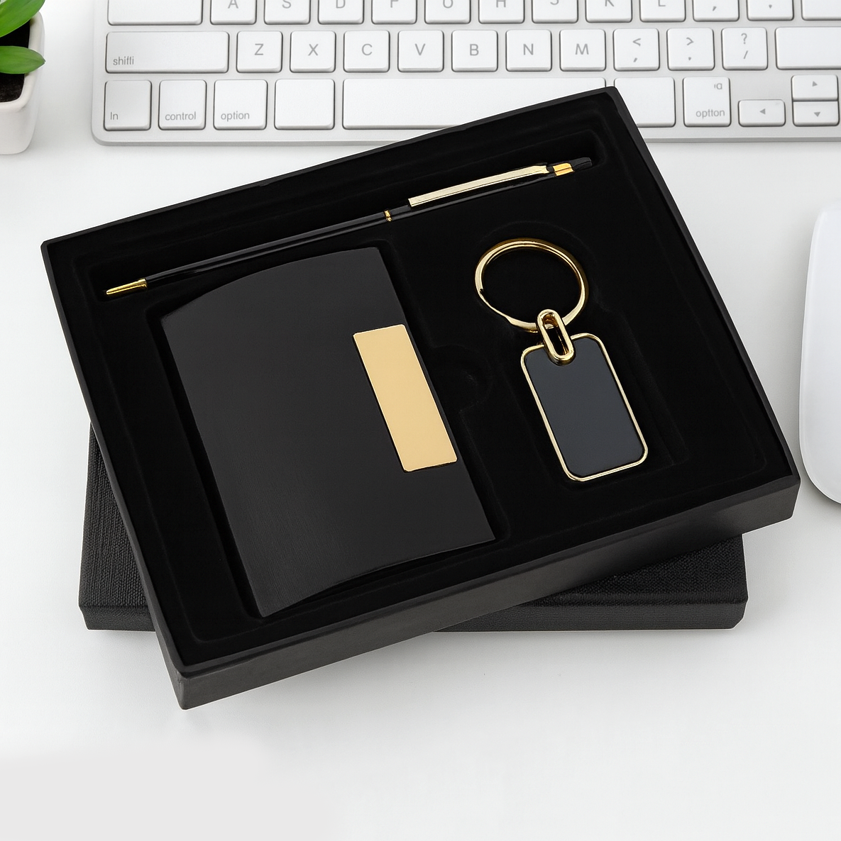 Looking for a premium corporate gift that perfectly blends elegance and practicality? The Essential Trio: Pen, Card Holder & Keychain set is the ideal choice for businesses aiming to make a lasting impression. Thoughtfully designed to elevate your corporate gifting strategy, this set is perfect for clients, employees, and business associates. Its modern and sleek design ensures it stands out, making it a memorable gift for any professional occasion.